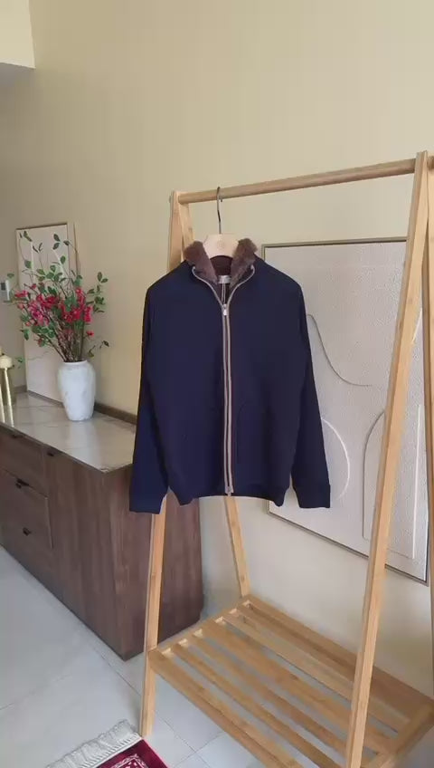 The Brunelo Fur-Lined Knit Zip Jacket combines warmth and sophistication, featuring a plush interior, ribbed exterior, and full zip closure for effortless comfort and style.