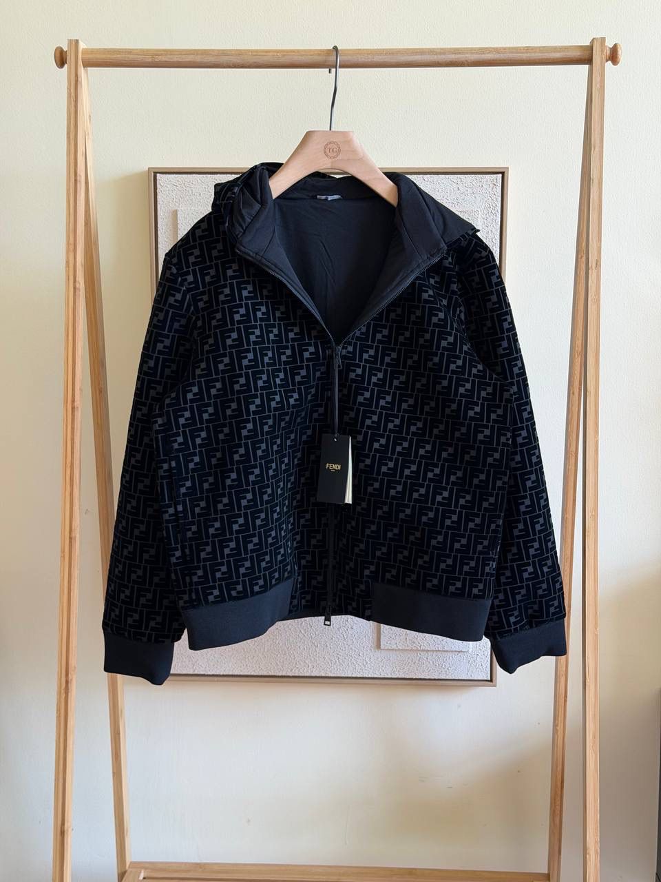 This Fendi jacket features a zip-front design with an all-over signature motif, a structured hood, and ribbed cuffs and hem for a clean, modern finish. Designed for comfort and easy layering, it offers a refined yet casual everyday look.