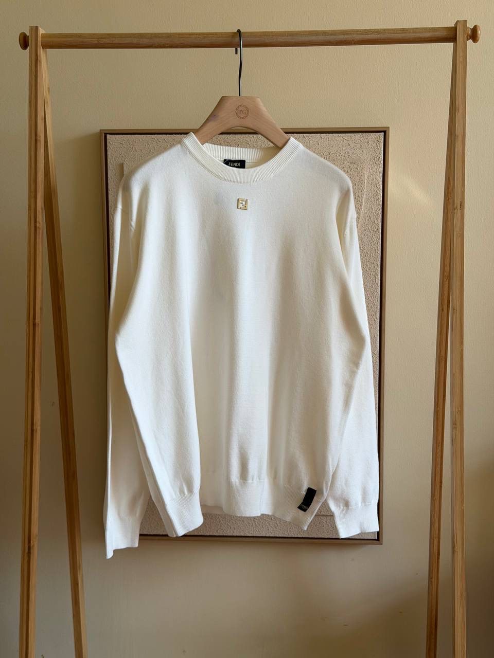 Regular-fit crew-neck pullover. Made of white wool yarn. Customised with a small palladium-metal FF logo applied on the chest. Finished with ribbed edges.