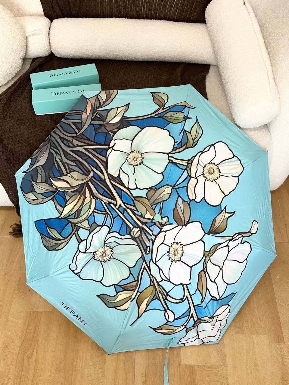 Brighten rainy days with this Tiffany & Co. umbrella featuring a vibrant aqua blue daisy print. Stylish and functional, it combines elegance with weather-ready durability for a standout accessory.